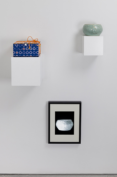 Broken celadon object, repaired with gold, gift box with computer-generated paper, specialized papers and ribbons, sealed with wax, x-ray of object framed with back lighting