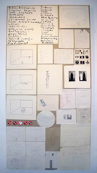 Untitled (Charts, Lists, and Drawings), 1970-1977Ink, marker, collage on paper, Xeroxes, and buttons on bulletin board