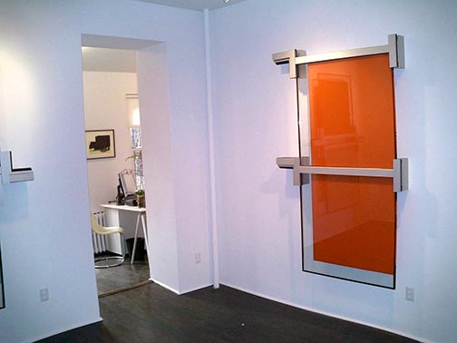 Aluminum, MDF, glass, wood, flourescent lamps, and hardware